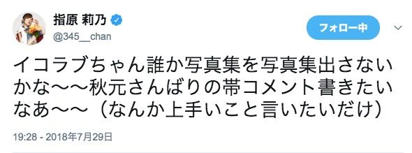 — 指原 莉乃 (@345__chan) 2018年7月29日