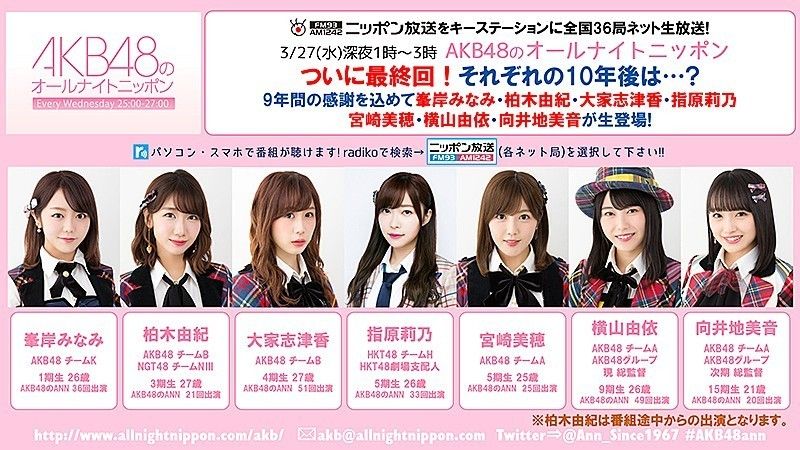 今夜1時~#AKB48 のオールナイトニッポン最終回😭#峯岸みなみ#柏木由紀 ※途中から出演#大家志津香#指原莉乃#宮崎美穂#横山由依#向井地美音