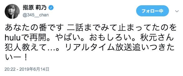 あなたの番です 二話までみて止まってたのをhuluで再開。やばい。おもしろい。秋元さん犯人教えて…。リアルタイム放送追いつきたいー!